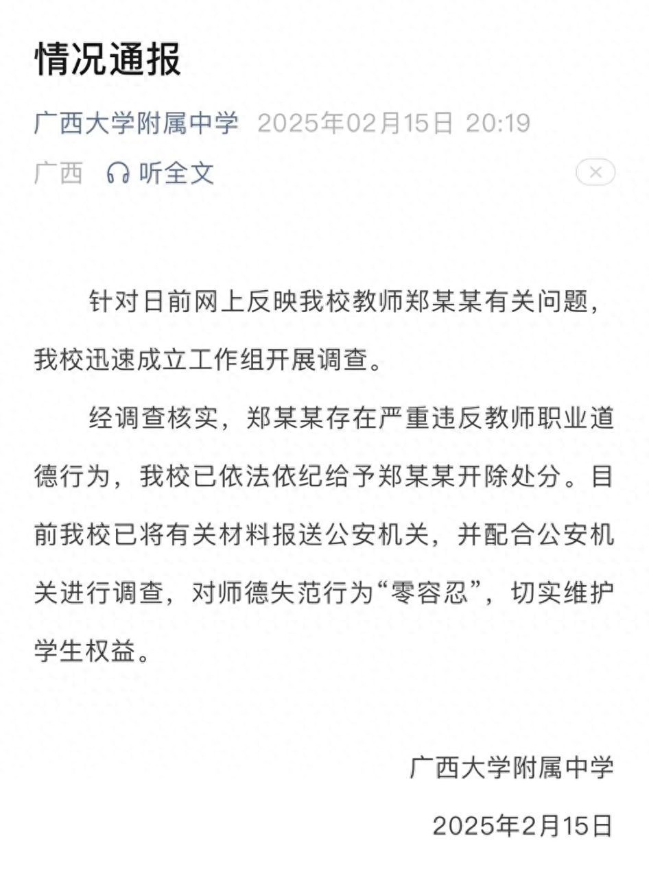发布日期:2025-03-09 03:00 点击次数:126广西大学附属中学微信公众号发布通报:针对日前网上反映我校教师郑某某有关问题,我校迅速成立工作组开展调查。